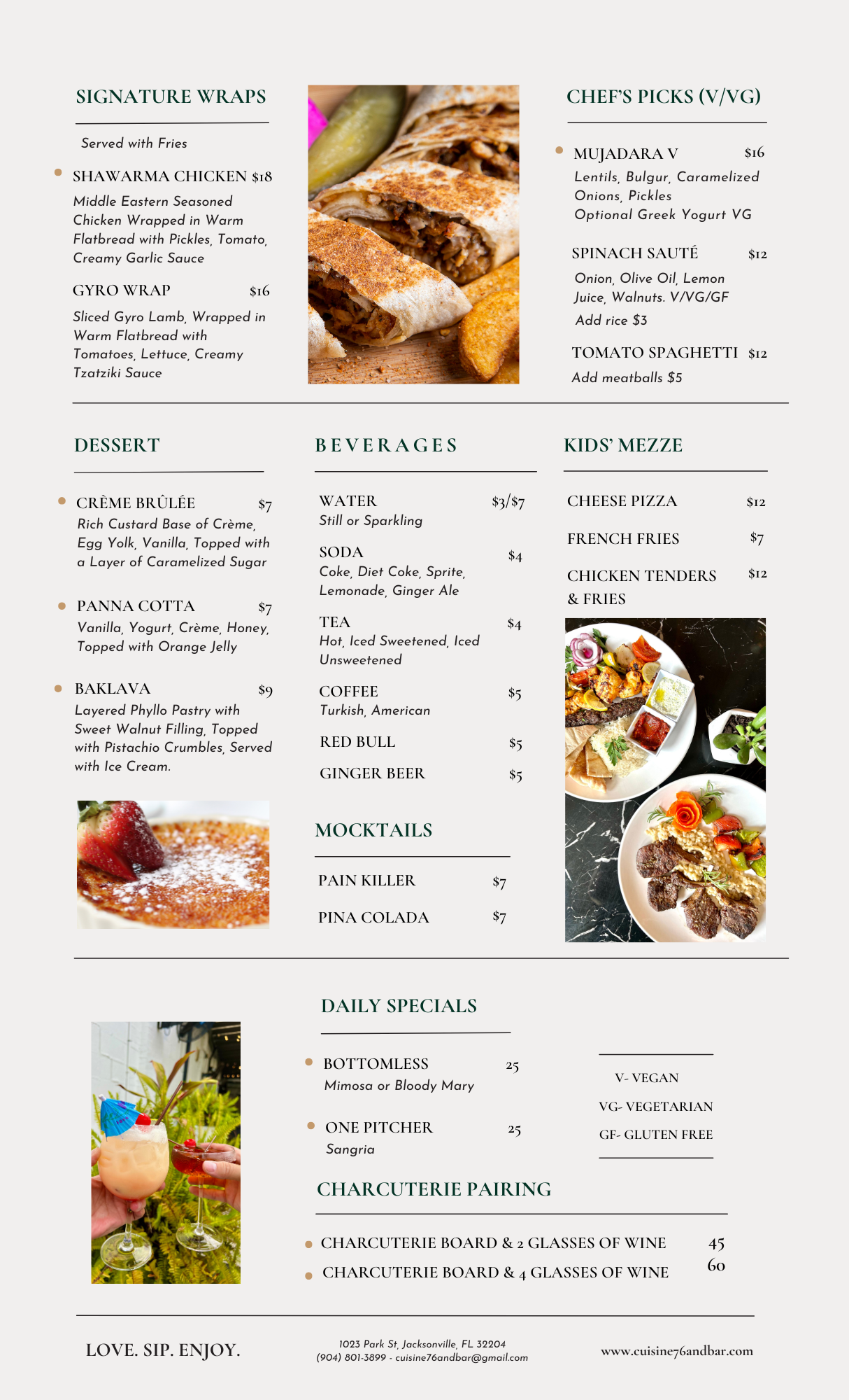 Enjoy our Riverside Mediterranean Cuisine, one of the best restaurants in Jacksonville, FL. We have dishes for everyone to indulge in. Have your pick from our full bar. Join us for daily Happy Hour and Fine wine tasting specials. Come by and check out our hidden patio. There’s so much more to experience!